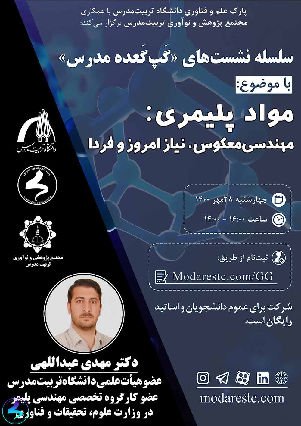 پارک علم و فناوری دانشگاه تربیتمدرس نشست گپگعده مدرس با موضوع « مواد پلیمری: مهندسی معکوس، نیاز امروز و فردا» را برگزار میکند.